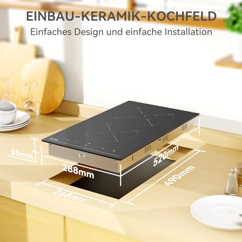【Ästhetisch und kompakt】Hermitlux einbauherd glaskeramikkochfeld fügt sich perfekt in die Arbeitsplatte ein, ist sehr leicht zu reinigen und zu pflegen und spart viel Platz in der Küche. Produktmaße: 520*288*55mm, Ausschnittmaße der Kochfläche: 490*268mm.