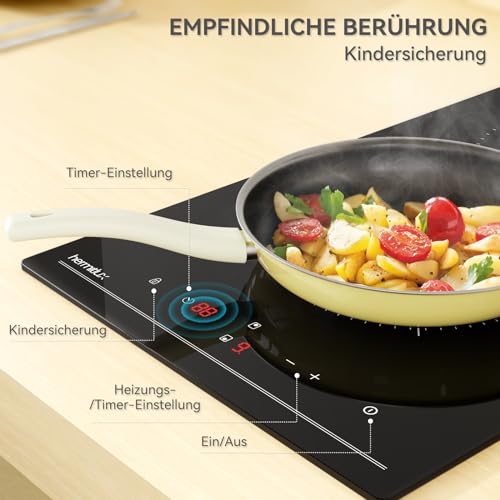 【2 Zonen und 9 leistungsstufen】Hermitlux 3300W kochfeld ist mit zwei Kochzonen für gleichzeitiges Kochen ausgestattet und verfügt über eine unabhängige Zonensteuerung für 1-9 Leistungsstufen. Er erreicht eine schnellere und effizientere Erwärmung und ist ein großartiger Partner beim Kochen.