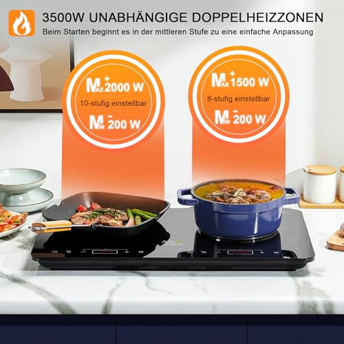 Induktionskochfeld 2 platten, Doppel-induktionskochplatte mit unabhängiger Steuerung 3500W, 10 Leistungs- und Temperatureinstellungen, 3-Stunden Timer, Touch-Steuerung, mit Glasoberfläche, Schwarz