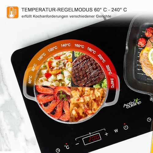 【Zwei Kochmodus】 Leistungsmodus und Temperaturmodus. Die Einzelkochplatte bietet 10 einstellbare Leistungsstufen (200 W – 2000 W) für das linke Kochfeld, und 8 Leistungsstufen (200 W – 1500 W) für das rechte Kochfeld. Wenn Sie Wasser schneller zum Kochen bringen möchten, wählen Sie eine höhere Leistung. Beide Kochfelder verfügt über 10 Temperaturstufen (60 ° C – 240 ° C). Mit empfindlichen IGBT Sensortasten können Sie die gewünschte Temperatur einstellen und Überkochen und Brennen vermeiden