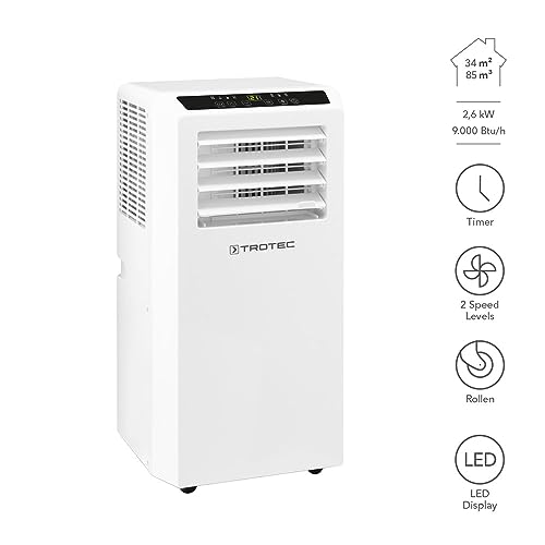 TROTEC PAC 2610 S mobile Klimaanlage 3-in-1 Kühlung, Ventilation, Entfeuchtung Monoblock-Klimagerät 2,6 kW 9.000 BTU/h 0,8 l/h Entfeuchtungsleistung für Raumgrößen bis 34 m²/85 m³ 2 Ventilationsstufen