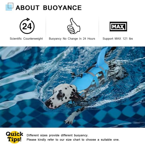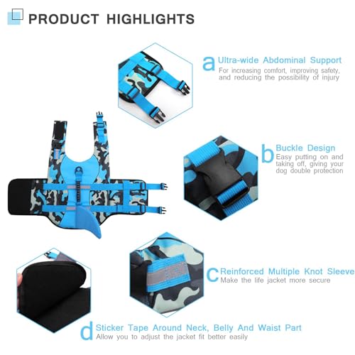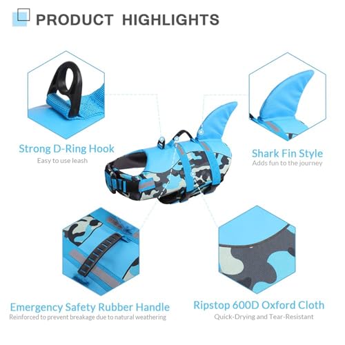 Schwimmweste Hunde Hai, Leicht und Sicher für Wassersport, hundeschwimmweste mit Griff und Reflektierend für Kleine Mittlere und Große Hunde, Blau Tarnung, S